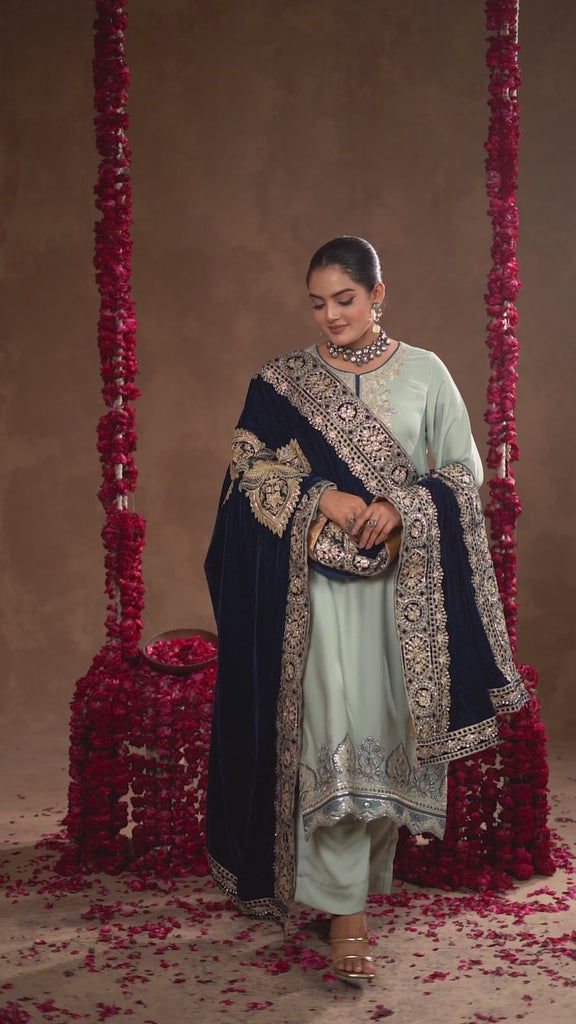 Step in royal winter luxury with this exquisite mist green raw silk readymade dress. It features gold threadwork, which graces the neckline and intricate floral tilla embroidery blooming along the hemline for timeless artistry. The dress comes with a matching pair of raw silk trousers for effortless comfort. Moreover, a plush zinc velvet shawl in deep navy color features opulent golden tilla embroidery and cascades dramatically for regal drama. With unique cultural details, the dress blends modern sophistication with heritage craftsmanship. Choose it to captivate in winter elegance.